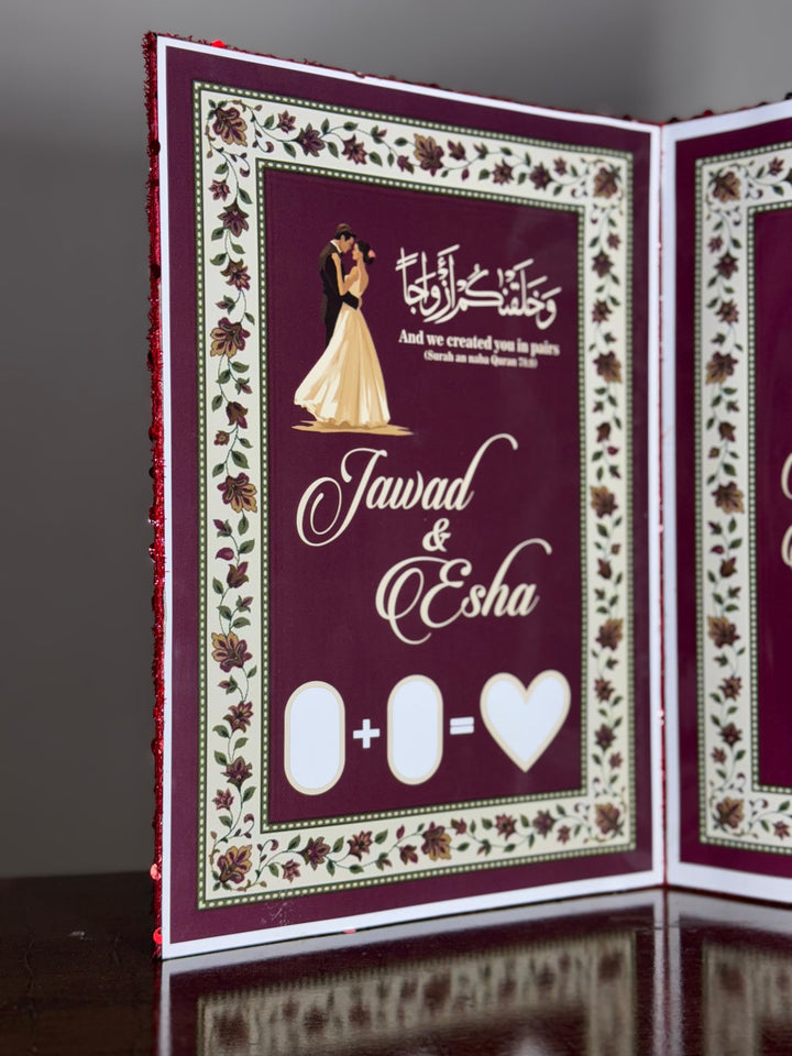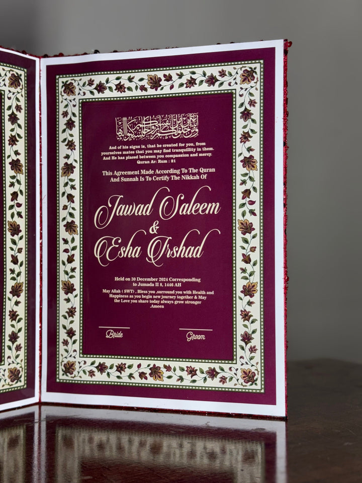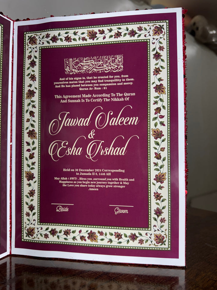 The booklet is made of velvet, a soft, plush fabric known for its smooth, rich texture. Velvet adds a sense of sophistication and formality, making it ideal for special occasions like a wedding.