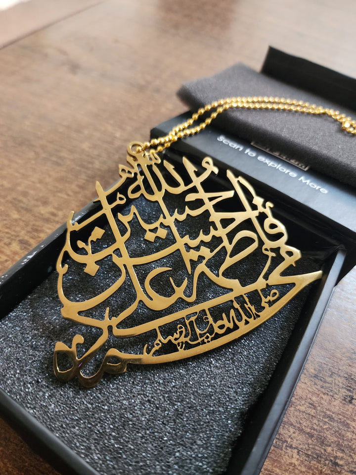 This Panjtan Pak Car Hang is a sacred and elegant accessory that beautifully honors the five revered figures in Islam: Prophet Muhammad (PBUH), Imam Ali (AS), Imam Fatimah (SA), Imam Hasan (AS), and Imam Hussain (AS). The design features their names in intricate Arabic calligraphy, meticulously plated in gold, offering a radiant and timeless finish.